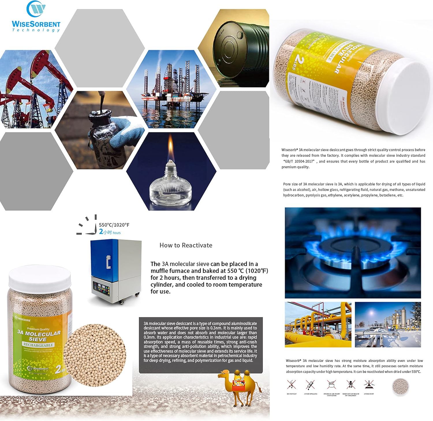 - 3A Molecular Sieve: Selective adsorption (water only), deeper drying, full regeneration requires muffle furnace (200–300°C), ideal for precision/industrial use