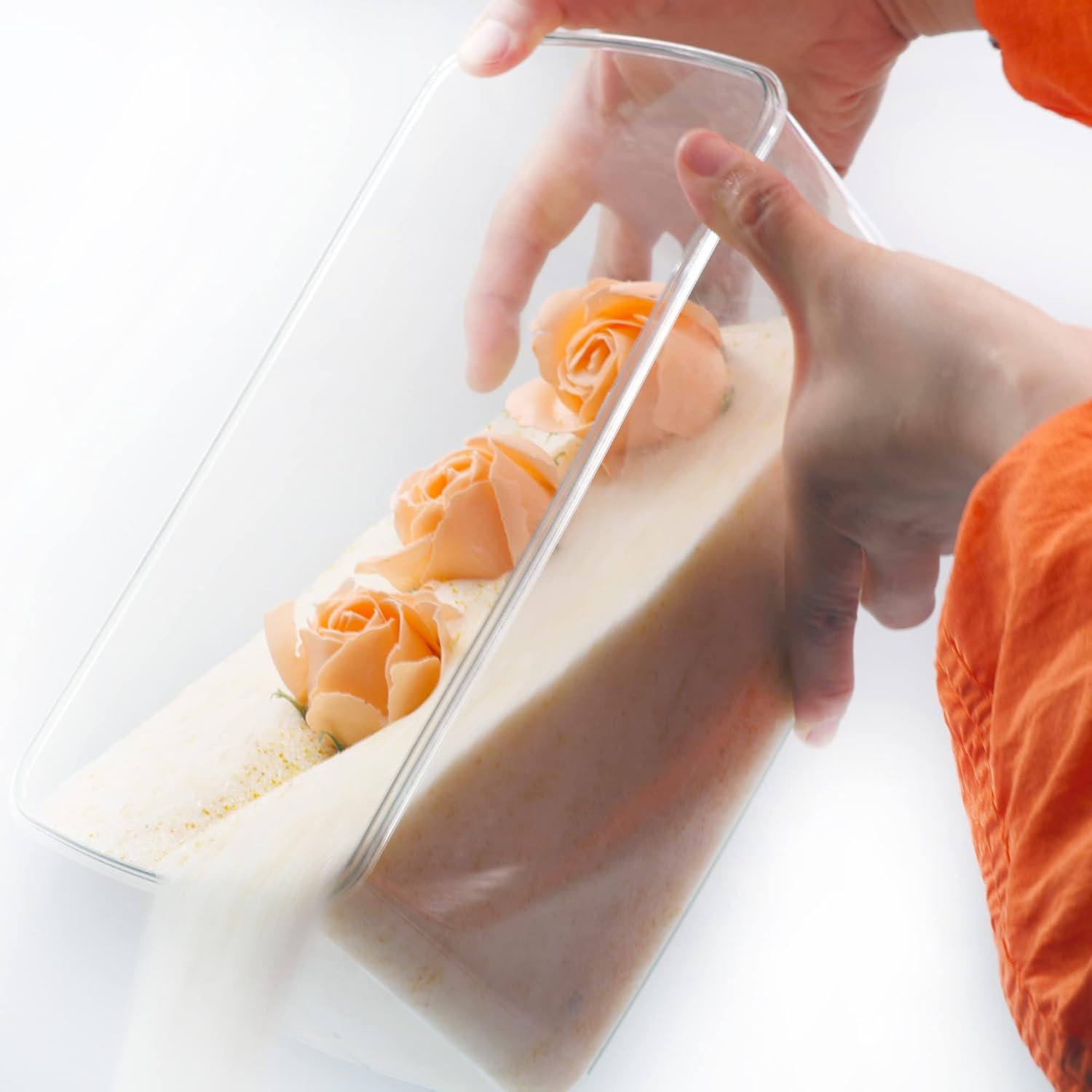 - Cover completely – Gently pour crystals around and over the flowers until fully submerged with at least 2–3 cm above the highest point.