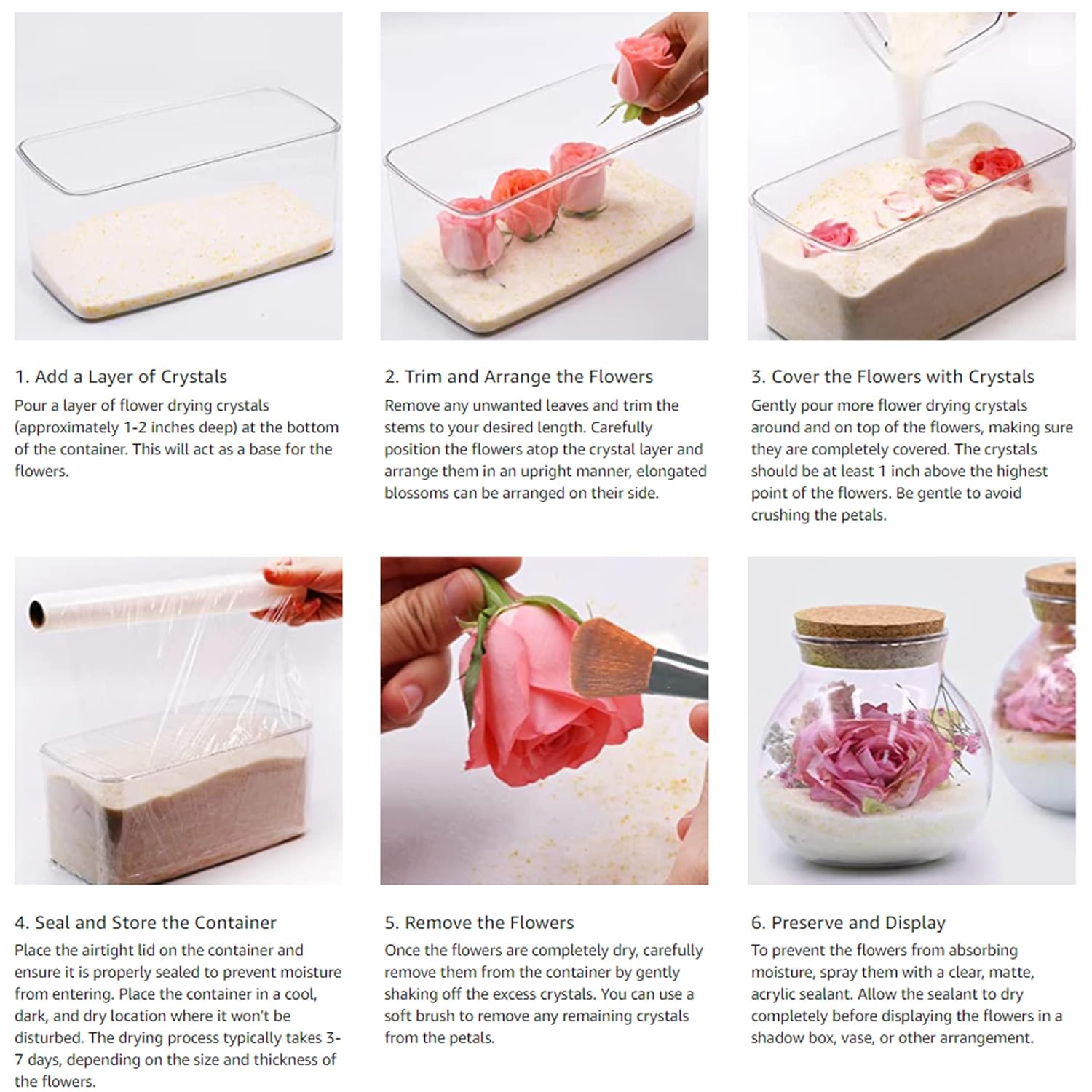 - Fine Crystals for Even Drying – Small particles penetrate easily between petals, ensuring uniform moisture absorption while preserving the natural colour and shape of your flowers.